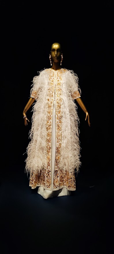 Près de trois cent vingt et une œuvres d’exception sont exposées, dont une grande partie fut restaurée pour l’occasion. Elles sont majoritairement issues des collections du MQB, très riches en textiles du Maghreb et d’Asie, mais certaines pièces proviennent d’autres institutions patrimoniales. Parmi les prêteurs publics, nous pouvons notamment citer le Musée des Arts Décoratifs, le Musée national des Arts Asiatiques – Guimet, le musée national d’histoire naturelle ou encore le musée des confluences de Lyon. Mais l’exposition accueille également des œuvres d’institutions étrangères, comme le Golden Silk Peach de Siem Reap au Cambodge, mais aussi privées avec le prêt d’échantillons de broderie de la Maison Lesage. La sélectionnée des œuvres s’est tournée vers le vêtement féminin, beaucoup plus riche en or que le vêtement masculin.
