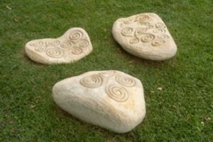 L’artiste contemporaine Solange Pessoa explore quant à elle ses croyances animistes à travers la création d’un ensemble cohérent de motifs mythologiques : spirales, empreintes… La plasticienne brésilienne traduit ces formes dans de la pierre de stéatite issue des mines près desquelles elle a grandi, et crée un univers où ces présences animistes rappellent celles des civilisations humaines les ayant léguées. Son œuvre semble être un hommage à des temps primitifs, grâce au format qui rappelle les runes et les vestiges mobiliers d’art rupestre que l’on connaît sur les parois des grottes dès le Paléolithique. Et pourtant, le titre de son œuvre semble impliquer une continuité : l’artiste s’intéresse beaucoup au subconscient : ici ces motifs évoquent en chacun presque immédiatement des rituels ancestraux et immémoriaux, se référant à un mythe solaire si l’on en croit le titre de l’œuvre. Les actions que sous-tendent ces motifs en font des rituels à la fois fantasmés par le regardeur, tout autant qu’ils ne semblent vraisemblables. L’artiste ne présente que rarement des œuvres isolées, privilégiant majoritairement des installations pensées en harmonie avec le lieu qu’elles habitent ; liant poétiquement l’humain et la nature tout en questionnant l’héritage du vivant dans son ensemble.