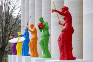 La reproductibilité de cette iconographie ne semble pas épuisée puisque, aussi récemment qu’en 2024 à l’occasion des Jeux Olympiques de Paris, l’œuvre de l’artiste belge Laurent Perbos intitulée La Beauté et le Geste, était déployée sur les marches de l’Assemblée nationale. L’artiste décline le motif en plusieurs couleurs, en référence au pop art, mouvement de la sérialisation par excellence. Les lacunes du marbre d’origine permettent aussi la dérivation du motif en imaginant à la Vénus de nouveaux attributs qui répondent à la thématique olympique de l’événement. Paradoxal pour une statue d’Aphrodite, déesse de la beauté, qui semble n’avoir aucune connexion avec les tournois sportifs du monde grec antique ? Sans doute. Mais l’œuvre, tout en démontrant la reproductibilité du canon antique, exemplifie l’association moderne entre l’art grec et les jeux olympiques.