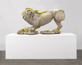 Tony Matelli, Lion (Bananas), 2022, béton et bronze peint. Présenté à la foire internationale Art Basel, 2022. © galerie Andréhn-Schiptjenko. https://www.andrehn-schiptjenko.com/art-fairs/60-andrehn-schiptjenko-at-art-basel-art-fair/