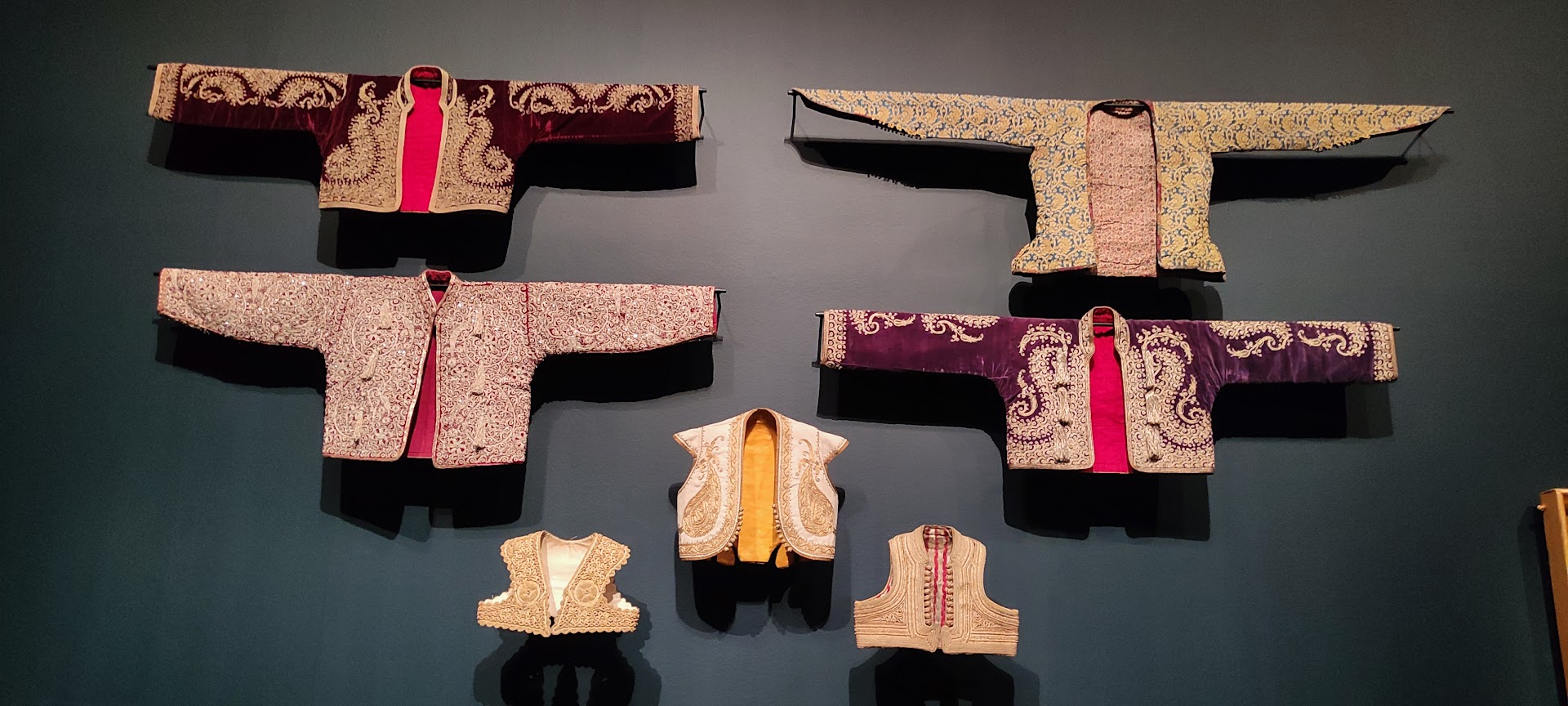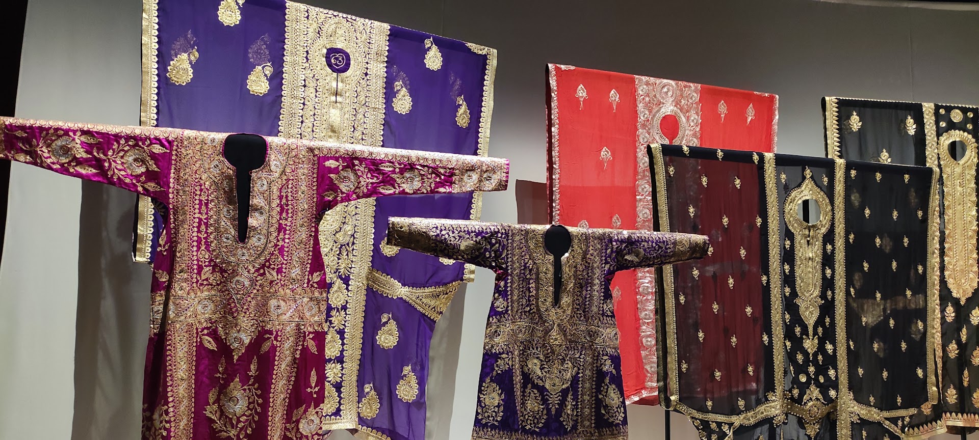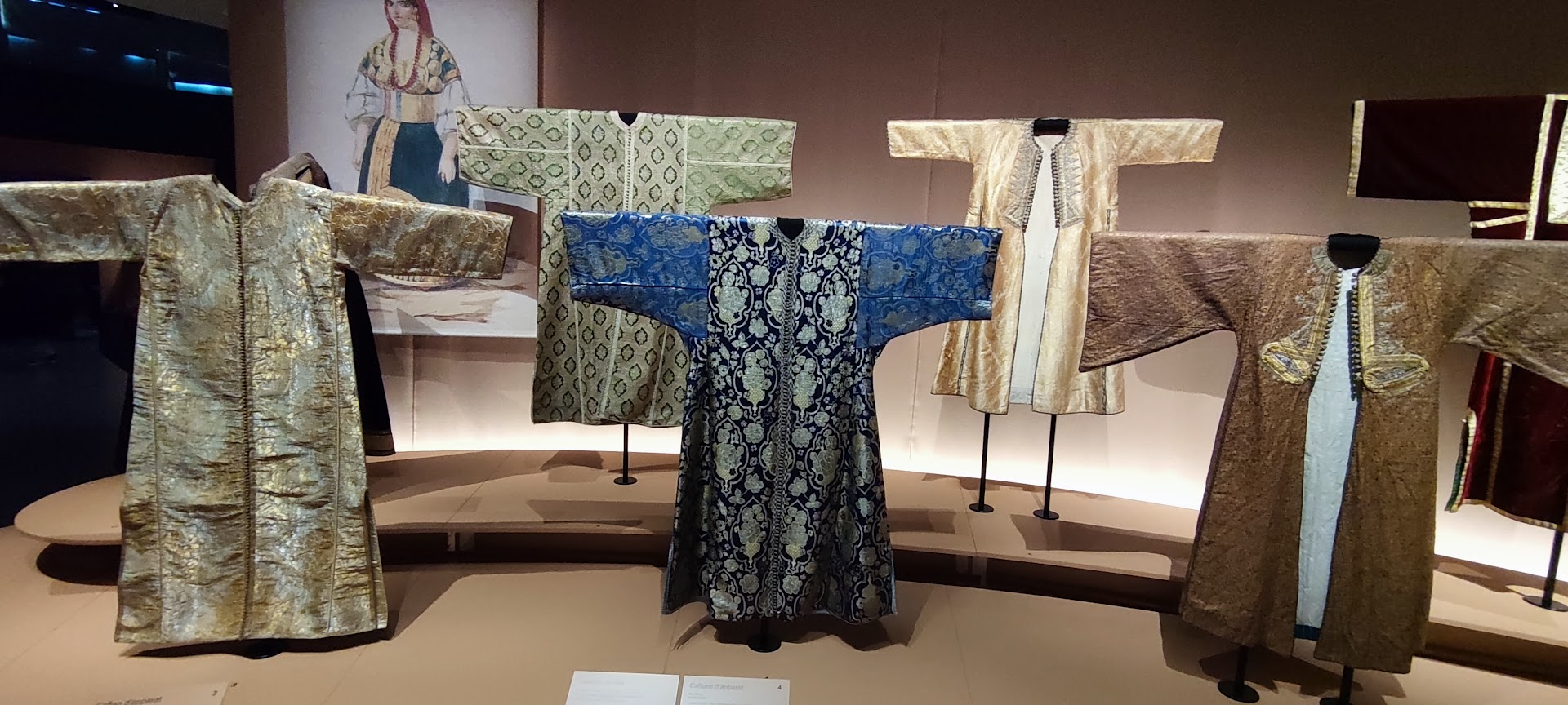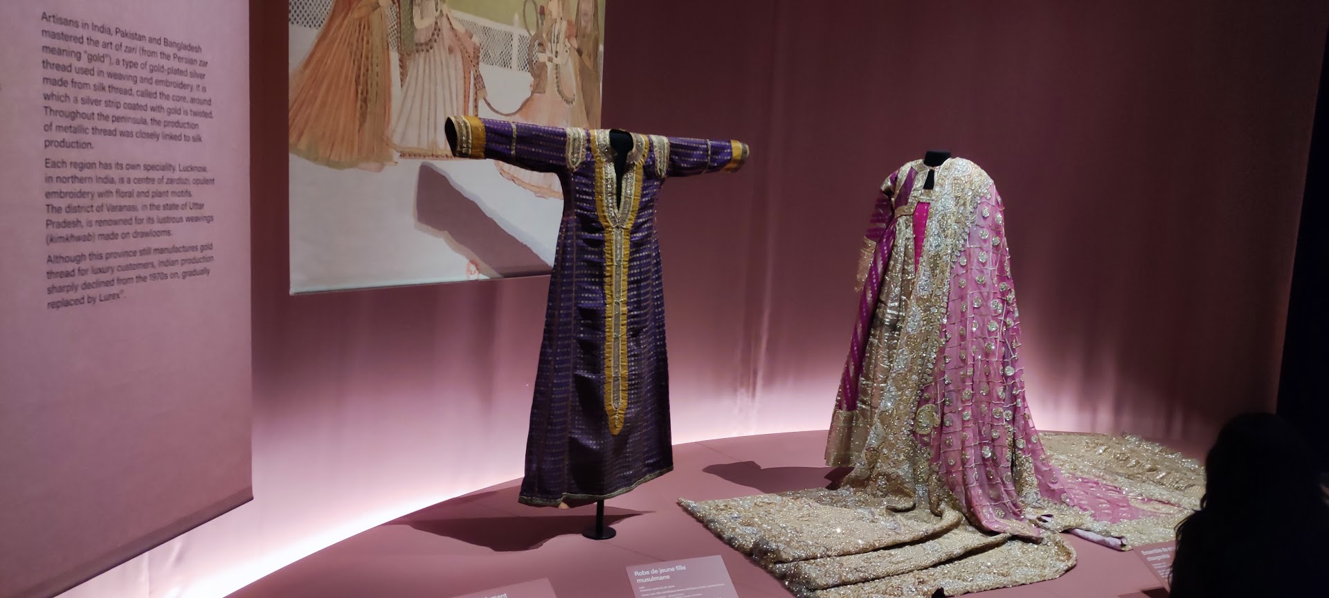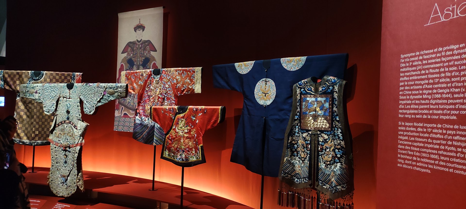 Près de trois cent vingt et une œuvres d’exception sont exposées, dont une grande partie fut restaurée pour l’occasion. Elles sont majoritairement issues des collections du MQB, très riches en textiles du Maghreb et d’Asie, mais certaines pièces proviennent d’autres institutions patrimoniales. Parmi les prêteurs publics, nous pouvons notamment citer le Musée des Arts Décoratifs, le Musée national des Arts Asiatiques – Guimet, le musée national d’histoire naturelle ou encore le musée des confluences de Lyon. Mais l’exposition accueille également des œuvres d’institutions étrangères, comme le Golden Silk Peach de Siem Reap au Cambodge, mais aussi privées avec le prêt d’échantillons de broderie de la Maison Lesage. La sélectionnée des œuvres s’est tournée vers le vêtement féminin, beaucoup plus riche en or que le vêtement masculin.