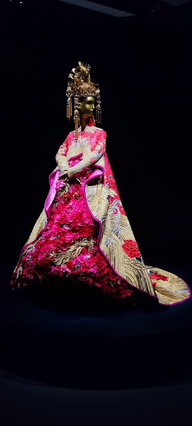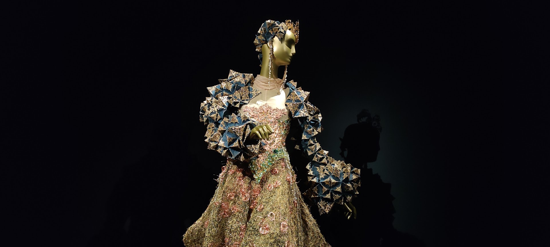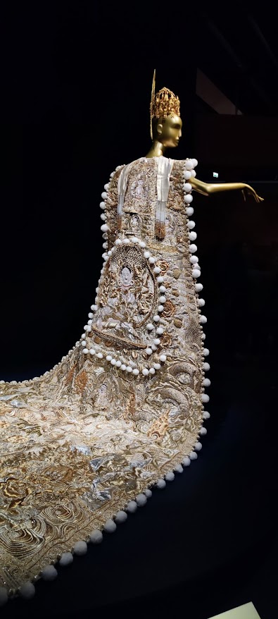 Quel intérêt pour un musée de présenter des créations de mode ? Sans doute faut-il y voir une opportunité de créer un dialogue entre art ancien et création contemporaine, mais aussi un moyen pour donner une nouvelle image du musée. Là où certains y voient une vieille institution poussiéreuse, avec des œuvres sans intérêt, voire un loisir uniquement destiné à une certaine classe sociale, la mode peut être un levier pour attirer d’autres publics et inscrire le musée dans son époque. Il suffit de pencher notre regard sur la campagne de communication pour s’en rendre compte: le vêtement choisi pour habiller l’affiche de l’exposition est la robe de mariée de Guo Pei. Pour rappel, l’exposition accueille plus de trois cent œuvres de différents musées contre dix œuvres la créatrice! Il est donc indéniable que la présentation des créations de cette styliste chinoise de renom est un argument marketing incontestable pour attirer le public au musée, notamment celui qui n’aurait pas l’habitude de s’y rendre. De même, pour les créateurs et les maisons de haute couture, l’exposition de leur patrimoine dans ces institutions muséales est aussi une grande campagne de communication et une valorisation de la marque. Certains pourraient même déplorer cette communication et la scénographie qui met bien en avant les robes de Guo Pei. Il faut dire que leur présentation sur un large socle et un fond uni bleu marine s’harmonisant parfaitement avec les reflets chatoyant de l’or sont parfaites pour les story Instagram !