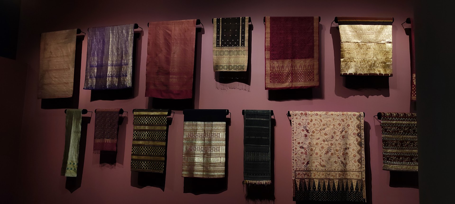 Le MQB ayant un grand espace modulable pour ses expositions temporaires, le visiteur n’enchaine pas une suite de salles en enfilade, mais plutôt un long chemin sinueux dont le changement de couleurs des cimaises et des kakemono indiquent une nouvelle thématique. Après la présentation historique et technique, le voyage du Maghreb au Japon au travers des collections textiles peut commencer: caftan, robes de mariées, vestes, écharpes, tenues de fêtes, coiffes, sari indien, sarong indonésien et kimono, autant d’œuvres précieuses se déploient sur les socles et les cimaises. Et les réactions du public ne se font pas attendre: les exclamations d’émerveillement face à ces œuvres qui en donnent plein la vue se font entendre durant toute la visite. Le choix de ce découpage géographique permet de mettre en avant les singularités de chaque culture.