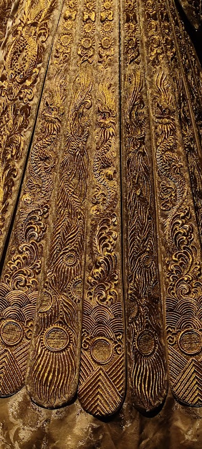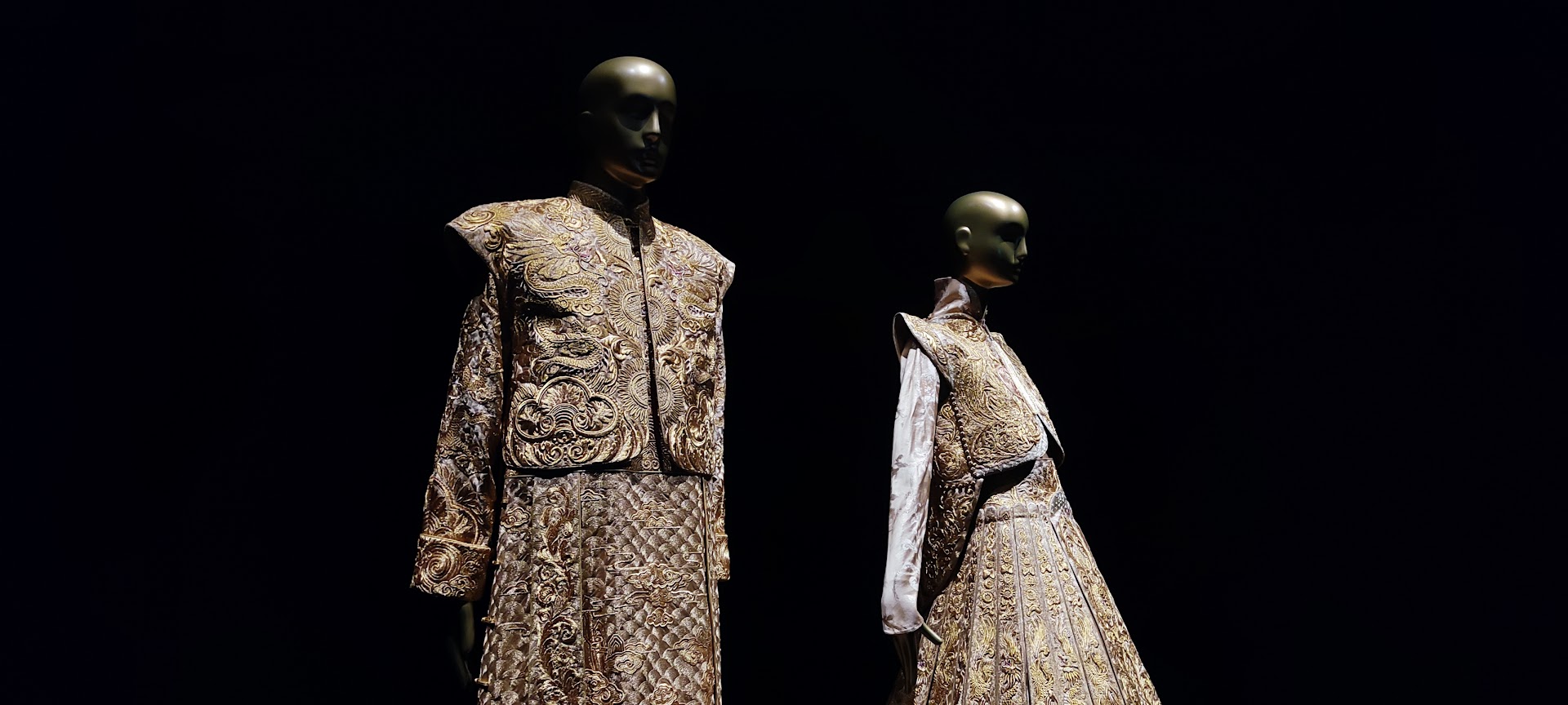 La création contemporaine est aussi de mise dans Au Fil de l’or, puisque l’exposition est organisée avec la collaboration de la créatrice de mode chinoise Guo Pei. Elle fait partie de la première génération de créateurs de mode chinois et l’une des premières du pays à s’être lancée dans la haute couture. Née en 1967, elle apprend très tôt la broderie aux côtés de sa mère avant de s’orienter vers les métiers de la mode dans les années 1980. A 30 ans, elle fonde “Rose Studio”, un des premiers ateliers de mode sur-mesure en Chine. Fascinée par l’histoire de son pays et inspirée par les mythes et les légendes, les créations de Guo Pei mêlent techniques traditionnelles et esthétique contemporaine. Soie, cristaux, pierres précieuses, plumes, perles et surtout or composent ses robes, qui demandent parfois plusieurs milliers d’heures de travail! Sur la base de l’héritage de la technique traditionnelle de broderie chinoise au point panjin, l’équipe de Rose Studio a développé la “broderie au fil d’or” en ayant recours à un fil d’or extrêmement fin pour une broderie de grande précision. De ce fait, le fil d’or est aujourd’hui une composante essentielle des créations de Guo Pei. Certaines d’entre elles sont exposées tout au long du parcours. Dès leur arrivée, les visiteurs peuvent admirer “les cinq somptueux petits ors”, une réplique à échelle réduite de Magnificent Gold, “L’or somptueux” que Guo Pei et son équipe ont mis près de cinq ans à produire. Par la suite, huit robes ponctuent le parcours.